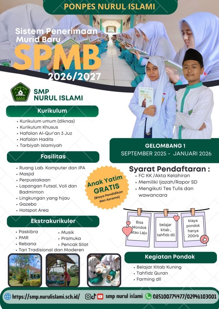 Selamat datang di halaman Sistem Penerimaan Murid Baru (SPMB) Tahun Akademik 2026/2027 SMP Nurul Islami Semarang. Silakan isi formulir pendaftaran dengan data yang benar dan lengkap sesuai dengan petunjuk yang diberikan.